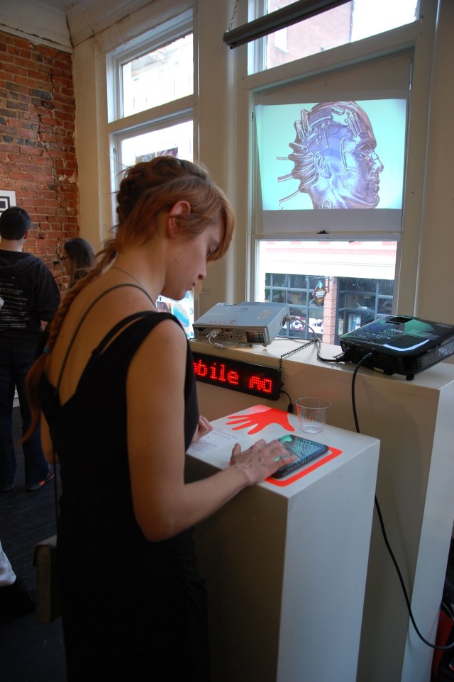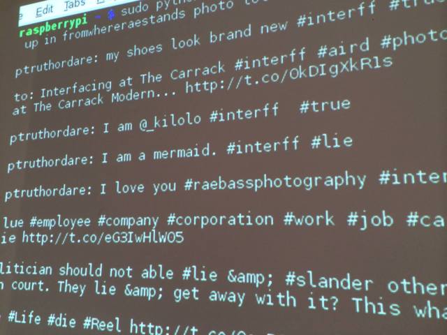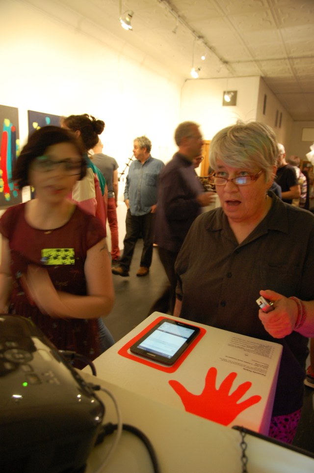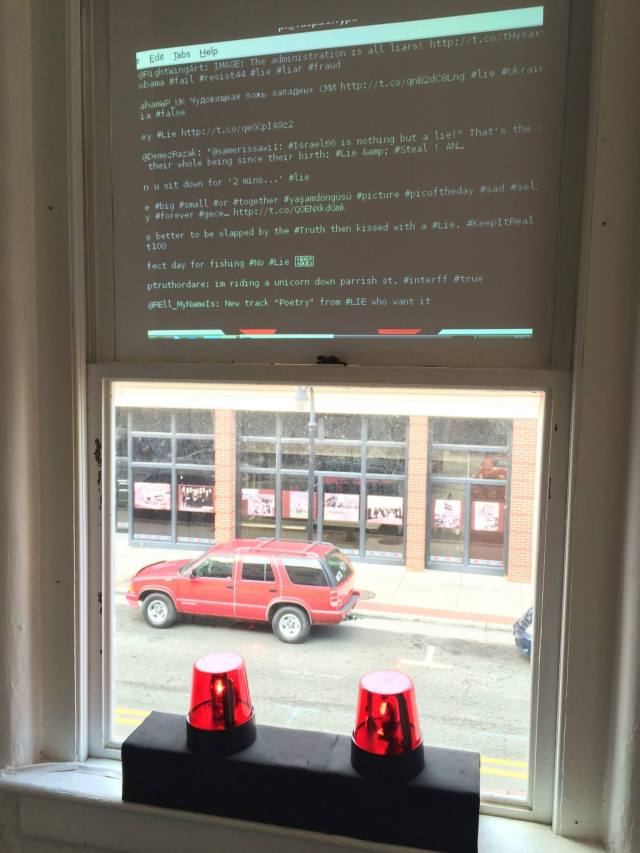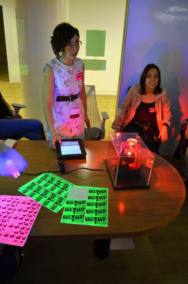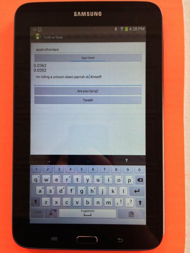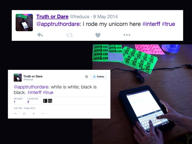 Truth or Dare is an interactive installation based on an add-on application for Twitter that measures whether a statement is true or false through biofeedback readings. Galvanic skin response (GSR) sensors execute readings of skin conductivity and use the variations of values to account for situations of emotional distress. The variations are explained by physiological behavior: in situations of stress our nervous system activates the sweat glands. The humidity of sweat lowers the skin’s resistance to electric current. The variation of conductivity is what is measured by the sensor and interpreted as emotional distress. Based on predefined calculations of baseline values of the current user, the app determines whether a statement is true or false – under the premise that lying disrupts the user’s emotional state. The app relays the information to Twitter and automatically labels the tweet with a hashtag#true or #lie based on the values that were read by the sensor.